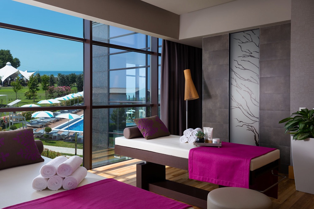 Специально для гостей: процедурные комнаты для пар, кабинет для детских СПА-процедур, процедурные комнаты с видом на море, фитнес-центр, открытые и закрытый бассейны, тропический душ, джакузи, лакониум (сухая греческая баня), финская сауна, хамам, парная с ароматерапией, русская баня.