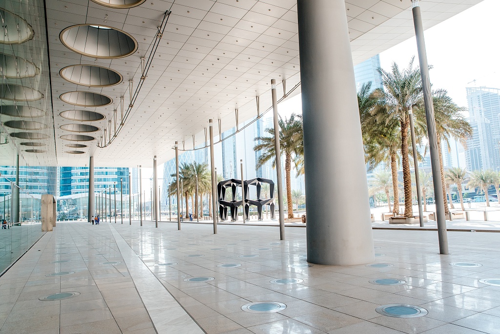 Вход в DECC украшает достопримечательность Дохи – гигантская геометрическая скульптура Smoke (ДЫМ). Она была разработана в 1967 году американским художником Тони Смитом и в том же году попала на обложку журнала TIME. Единственная крупномасштабная работа Смита, когда-либо созданная специально для внутреннего пространства, Smoke теперь очаровывает прохожих на открытой площади.