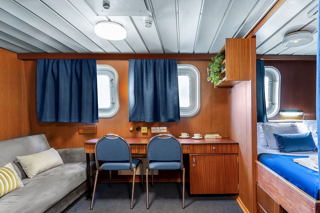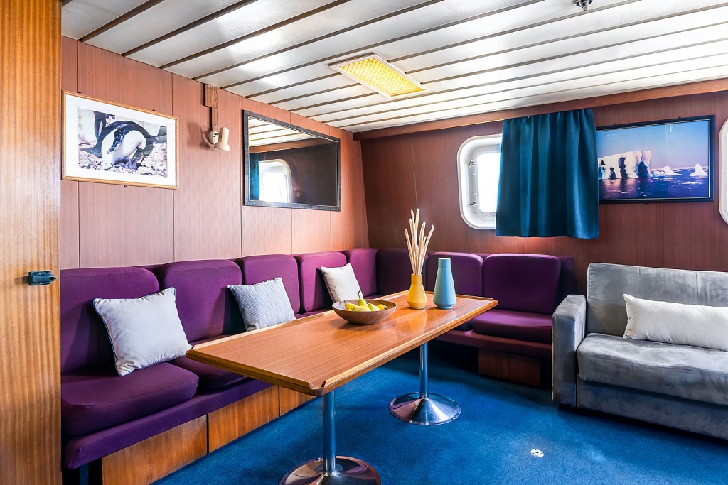На судне 28 кают разного класса: от стандарта до люкса, но в любой каюте гости будут чувствовать себя удобно и уютно. Условия можно сравнить с отдыхом в отеле. На борту два ресторана, завтрак проходит в формате «шведский стол», ужин – a la carte (уже намечено, что в 2023 году организаторы позовут в экспедиции шеф-поваров из ресторанов, отмеченных звездой Michelin). Обед участники берут с собой в ланч-боксах либо делают на берегу пикник с барбекю. Помимо кают и обеденной зоны на корабле есть зона отдыха (она же библиотека и бар). На судне множество уединенных мест для наблюдения за океаном на разных палубах.