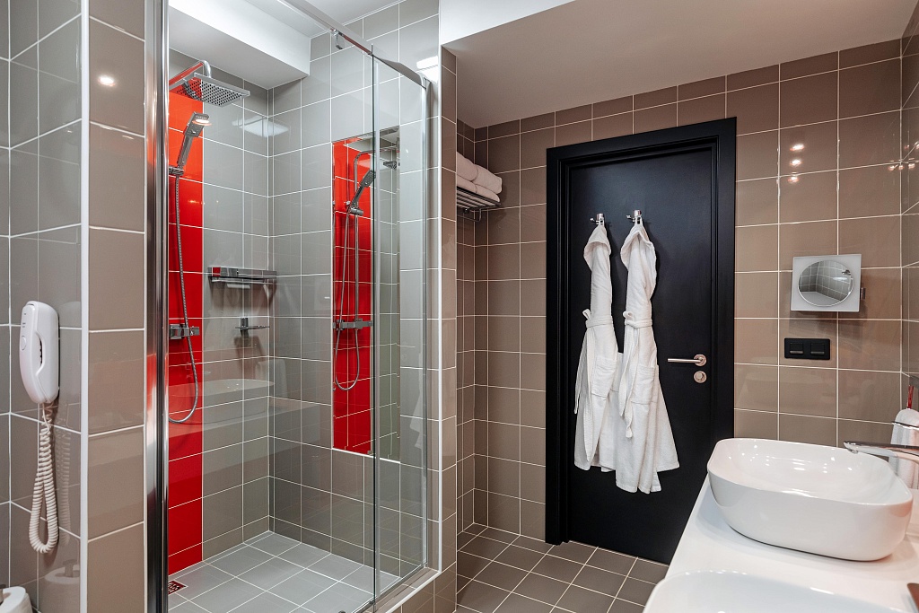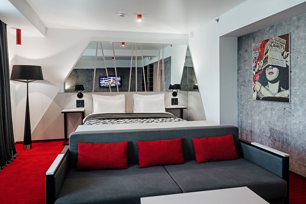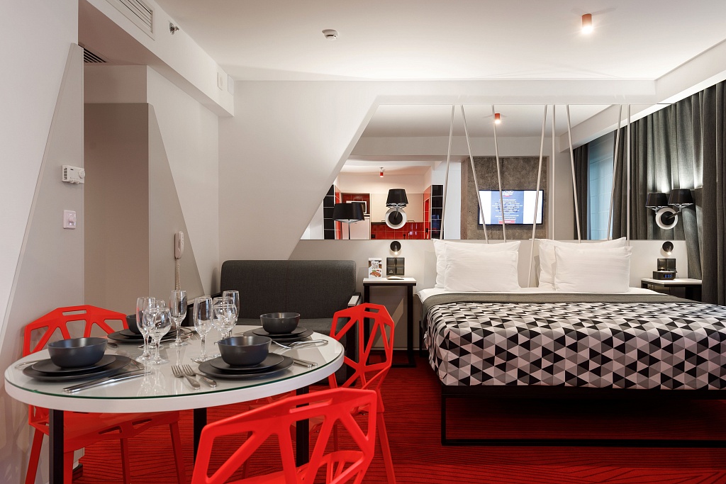Номера выполнены в смелом цветовом решении – контрастном монохроме с оттенками серого и яркими красными акцентами. Расположены на 24 и 27 этажах.