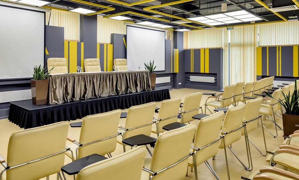 Один из самых больших залов отеля выполнен в виде амфитеатра и оборудован удобными мягкими креслами. Высокая сцена, большие панорамные окна, возможность разделить зал мобильной перегородкой на два отдельных помещения – все это идеально подходит для проведения крупных презентаций, конференций и видеотрансляций. В конференц-зале установлена встроенная акустическая система для воспроизведения звука в театральном режиме, что позволяет использовать его в качестве кинозала. Зал выдержан в классическом стиле, без колонн. Неоспоримым преимуществом зала является наличие смежных дверей с двумя переговорными комнатами, которые могут быть незаменимы для проведения закрытых совещаний во время крупных мероприятий.