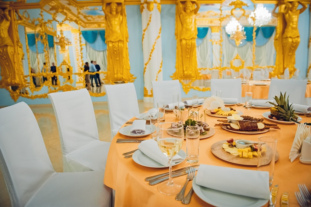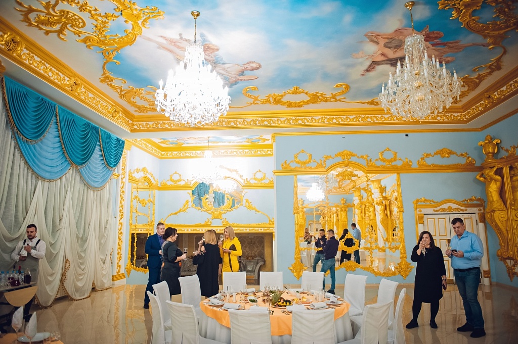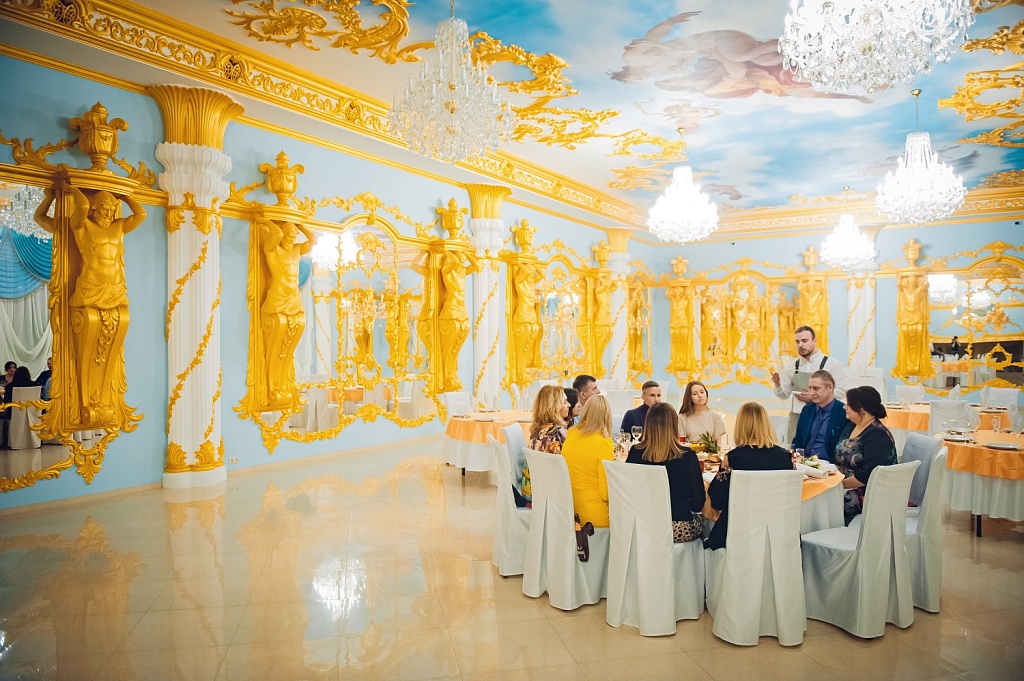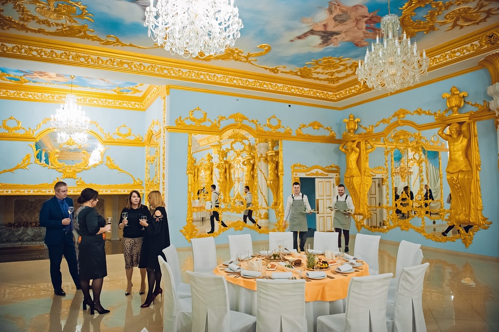 В нашем случае эта иллюзия еще больше усилилась, когда мы поднялись по парадной лестнице на ужин в … Версаль! Да, именно такая ассоциация первой пришла в голову, когда мы увидели убранство банкетного зала. Как нам пояснили, за основу взят зал Екатерининского дворца. Много золота, расписные плафоны, мраморные полы, атланты и кариатиды, небесно-голубые стены и зеркала. Юбилеи и свадьбы здесь незабываемые. Корпоранты в этих стенах любят устраивать балы в старинном стиле, но иногда придумывают и что-то контрастное – например, вечеринку в стиле 90-х.