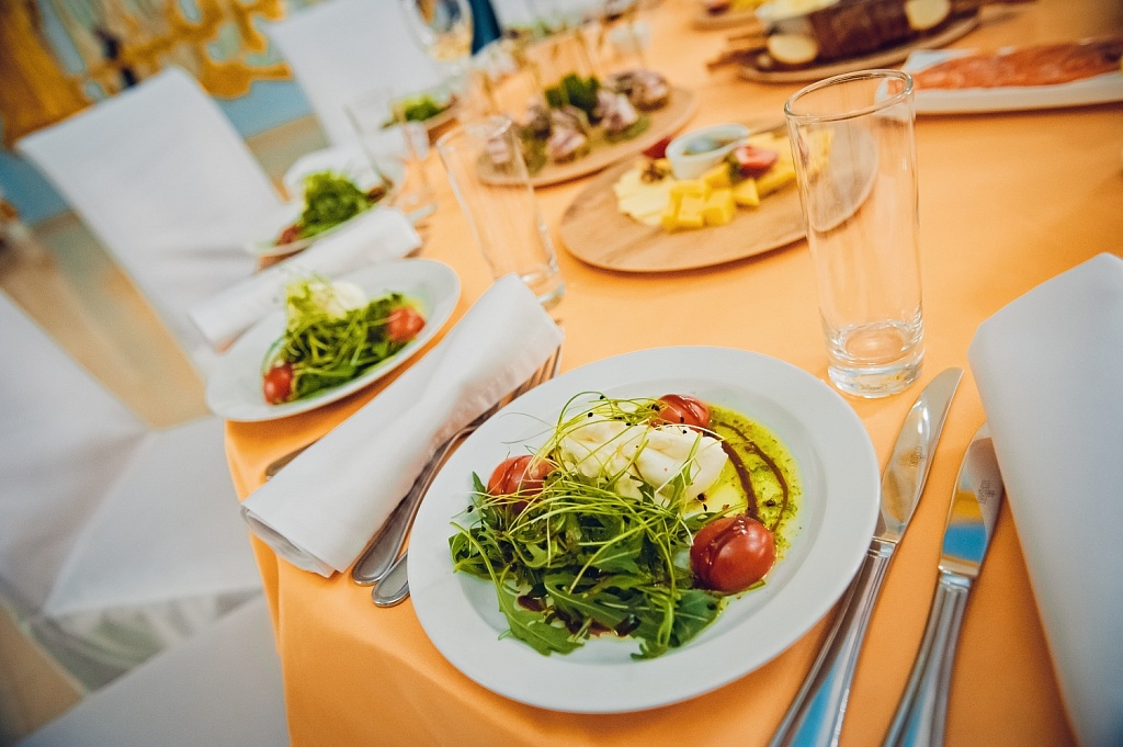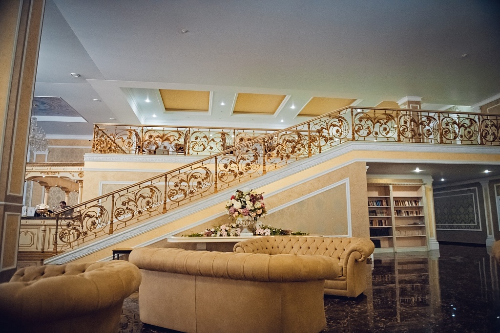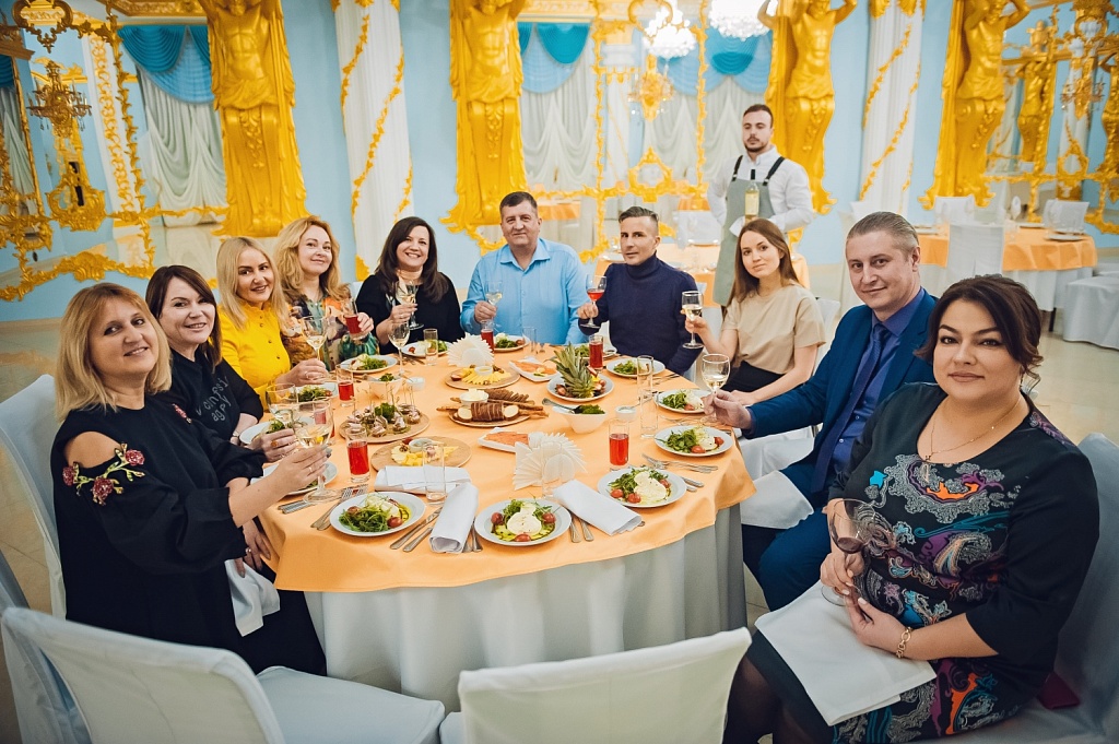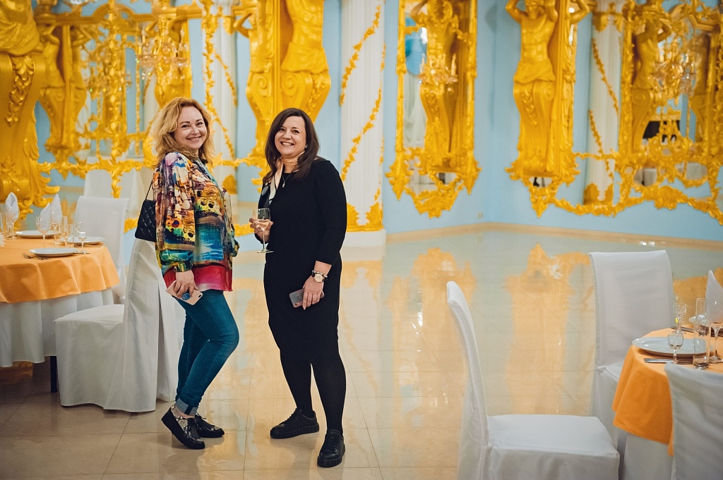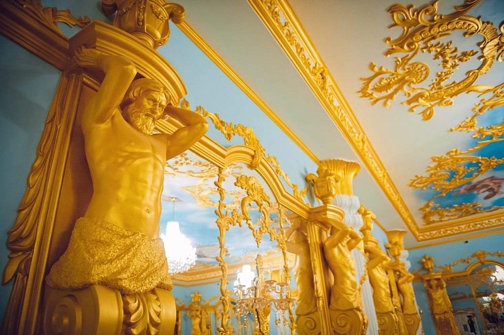 В нашем случае эта иллюзия еще больше усилилась, когда мы поднялись по парадной лестнице на ужин в … Версаль! Да, именно такая ассоциация первой пришла в голову, когда мы увидели убранство банкетного зала. Как нам пояснили, за основу взят зал Екатерининского дворца. Много золота, расписные плафоны, мраморные полы, атланты и кариатиды, небесно-голубые стены и зеркала. Юбилеи и свадьбы здесь незабываемые. Корпоранты в этих стенах любят устраивать балы в старинном стиле, но иногда придумывают и что-то контрастное – например, вечеринку в стиле 90-х.