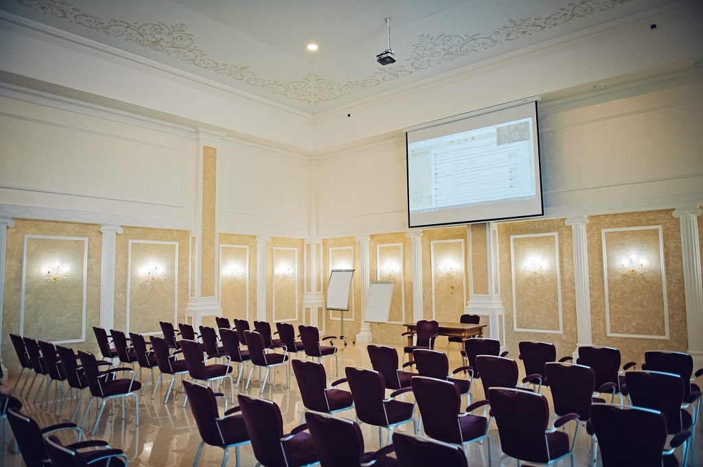 Для проведения бизнес-мероприятий или для банкета в строгом классическом стиле есть просторный конференц-зал с дневным светом и качественной аппаратурой на 100 мест при рассадке «театр».