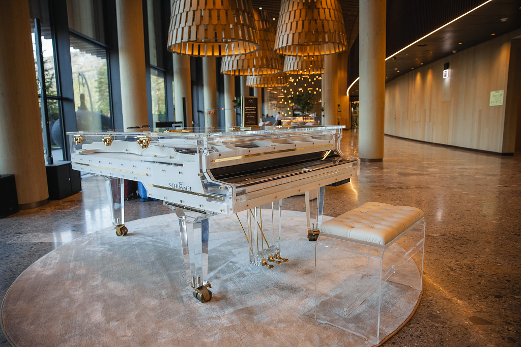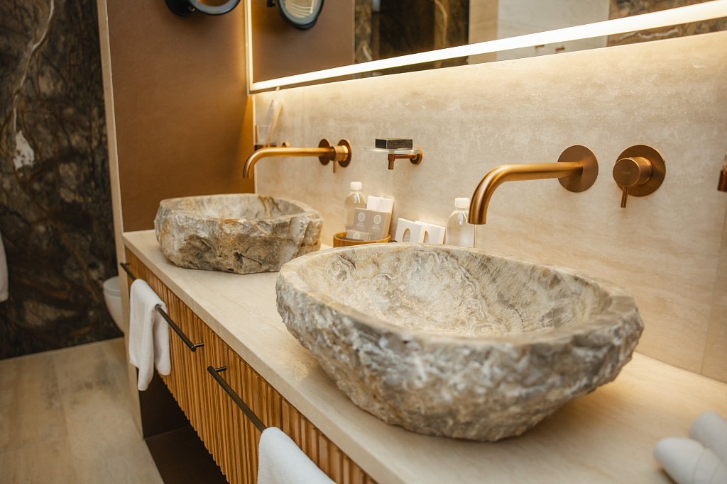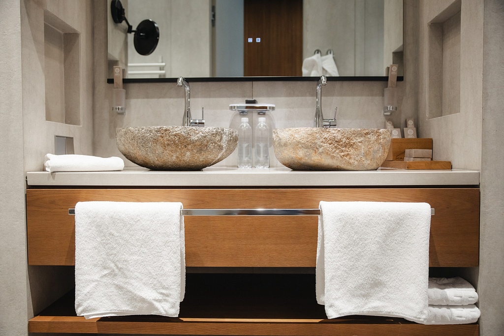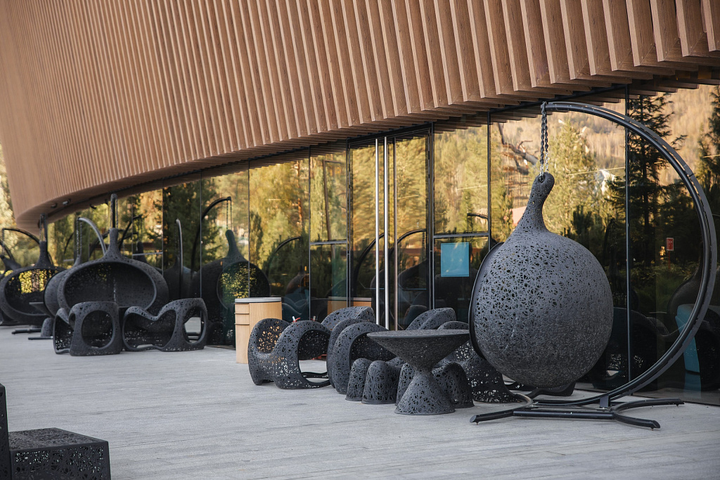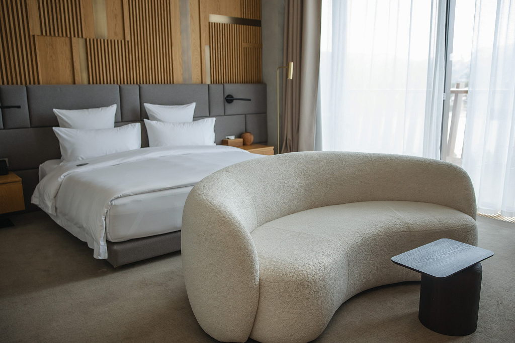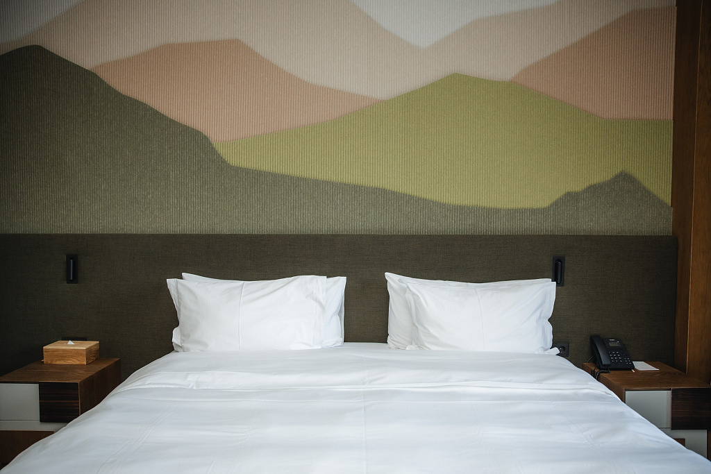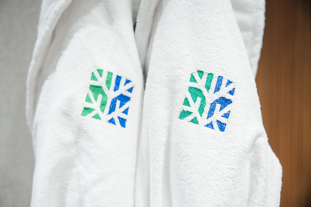 Огромное здание отеля «Манжерок» лежит у подножия горы как подкова на счастье. С одной стороны, впечатляют его размеры. С другой – удивляет внимание к деталям. Во многих локациях это реальное арт-пространство. И даже в номерах глаз отмечает художественные решения, причем вдохновленные местной природой. В номере все продумано до мелочей, чтобы гость получил удовольствие от отдыха при любой погоде. Особенно тронул уютный плед, с трудом сдержались, чтобы не укутаться в него «до дома».