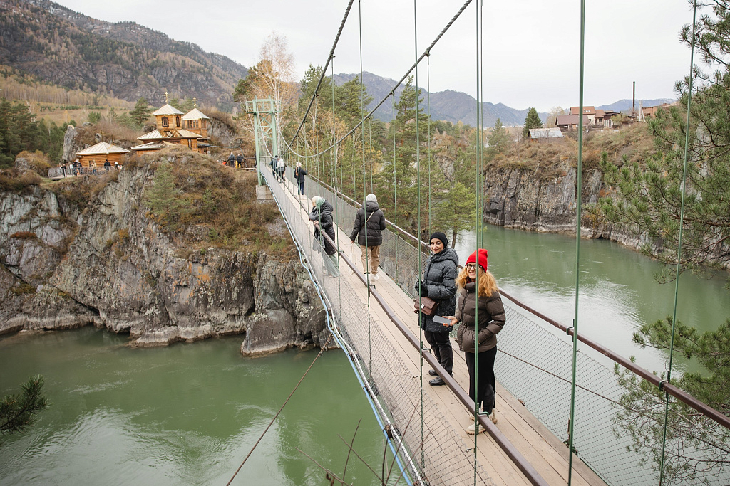 Мы очень благодарны организаторам, что они не только щедро показали нам курорт, но и повозили немного по Алтаю, причем сделали это с компанией «ЛБ Тур», о которой мы недавно писали на нашем сайте. Один день из нашей программы был отдан экскурсии «Чемал – горячее сердце Алтая». Кто не знает, Чемал – это место с уникальной концентрацией красот и знаковых уголков региона. Запомнились рассыпанные по бурной Катуни «зубы Дракона» и остров-скала Патмос, на котором одиноко высится церковь, зовущая к себе путников. К ней надо пройти по удивительному подвесному мосту. Также мы прошлись по «Козьей тропке» и вышли на смотровую площадку, с которой открывается слияние двух рек.