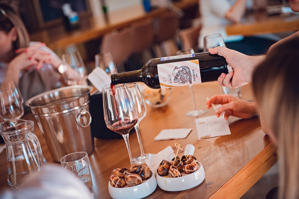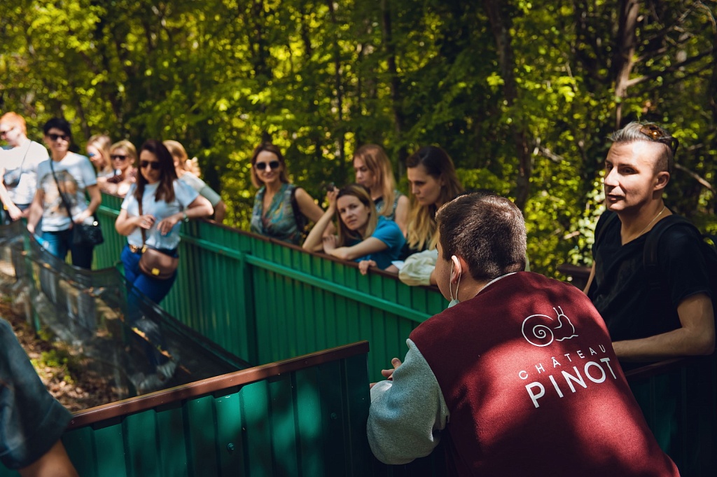 У подножья горы Колдун простираются совершено европейские пейзажи с бесконечными виноградниками, морской лазурью и горными вершинами. Не менее вдохновляюще продумана инфраструктура винодельни Шато Пино - высокотехнологичное производство, дегустационные залы, видовой ресторан, смотровые террасы, арт-галерея, музей ретроавтомобилей, магазин... После вдохновляющей экскурсии мы с удовольствием попробовали 6 сортов вина и улиток в сырном и чесночном соусе.