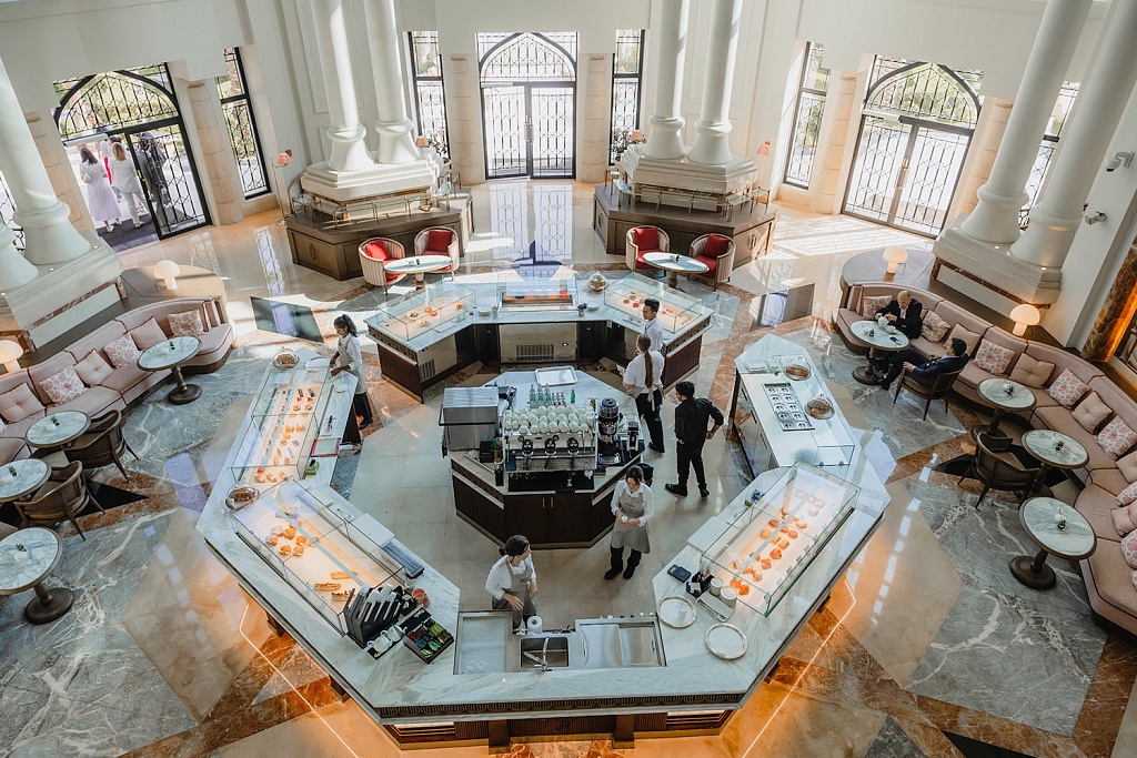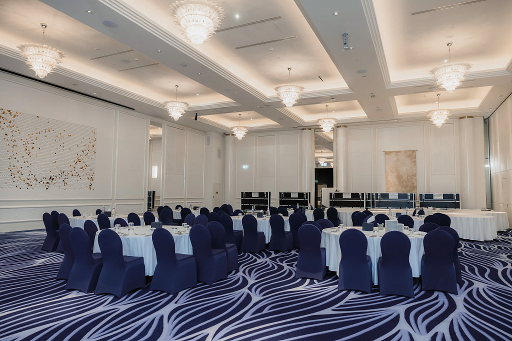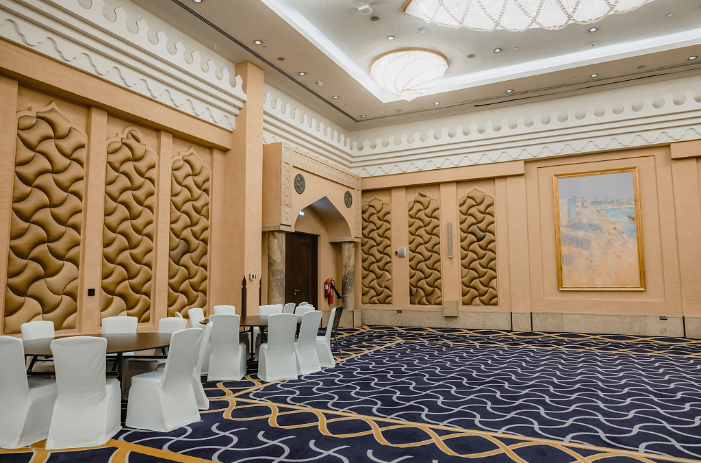 Общая площадь пространства для деловых и торжественных мероприятий – 4500 м2 с вместимостью до 1550 человек. Все конференц-залы находятся на отдельном этаже с отдельным входом. Здесь один из самых просторных банкетных залов в Дохе (1850 м2) с естественным освещением и панорамным видом на Арабский залив, он оборудован выходом на просторную террасу, открывающую великолепный вид на бассейн. Grand Foyer, ведущее в Grand Ballroom, может похвастаться самыми высокими потолками в Дохе. Во время инспекции нам удалось посмотреть «закулисье» – как готовят в залах мероприятие для большой группы из России. Всегда полезно знакомиться не только с залом, но и с его бэкграундом, с тем, как слаженно работают все службы.
