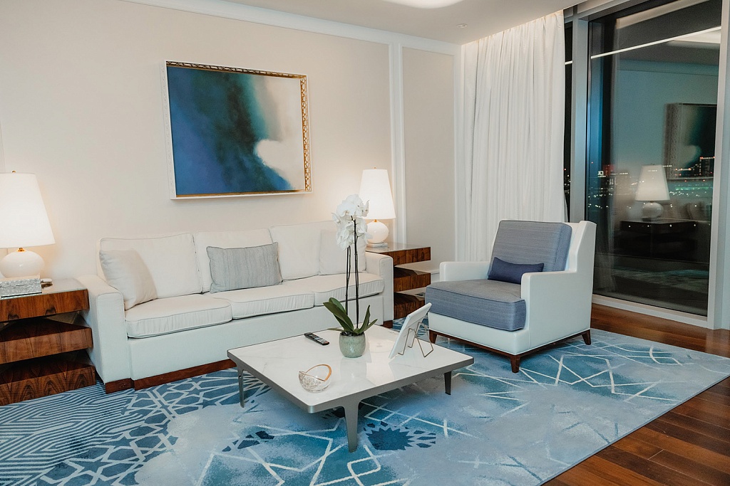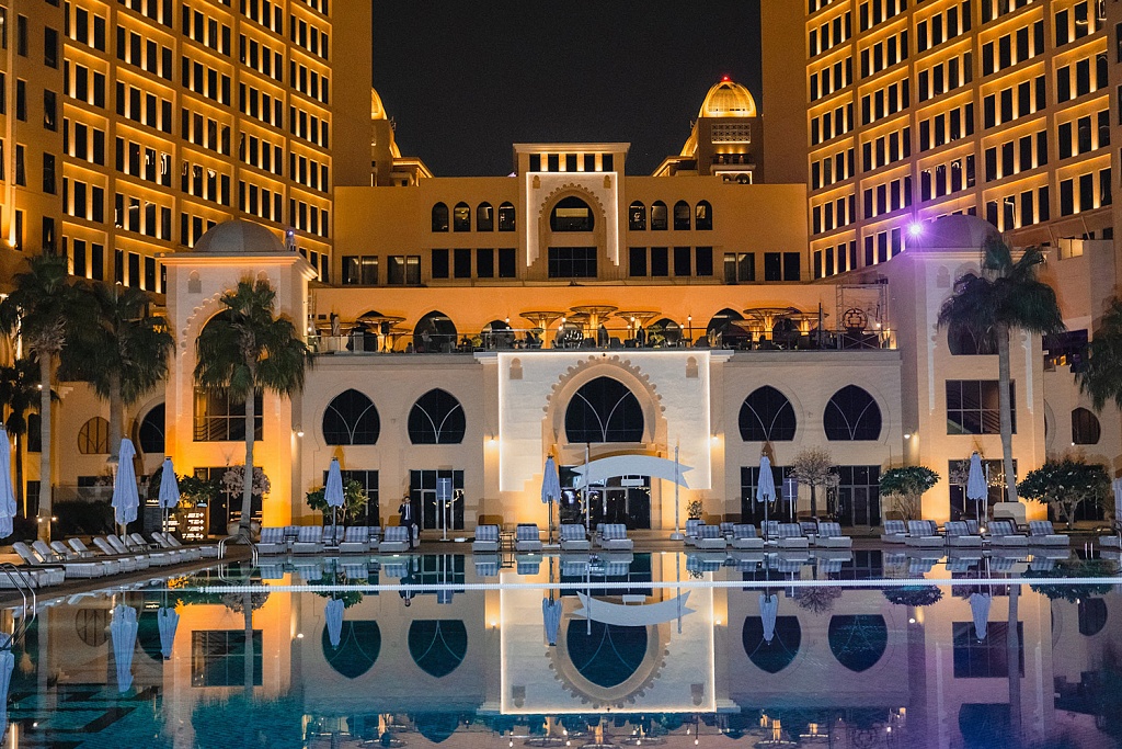 Мы уже неоднократно рассказывали про этот отель, но с удовольствием повторим краткую информацию. В оформлении отеля царит высокий художественный вкус. Порой кажется, что ты оказался в пространстве современной галереи. Из просторных номеров открывается живописный вид на Арабский залив и городской пейзаж. Все номера элегантно оформлены в современном стиле, они выходят на уютный балкон и отличаются исключительно хорошей звукоизоляцией. Для бизнес-мероприятий отель предлагает комплекс конференц-залов и переговорных комнат, которые занимают целый этаж и располагают разными входами в prefunction-зону. Убранство классическое. Особый восторг вызывает ballroom Al Wosail (в котором можно демонстрировать даже автомобили) и холл перед ним полукруглой формы с огромной стеклянной стеной. Нередко на красивых торжествах холл используют как атмосферный банкетный зал, а в ballroom оформляют welcome-зону. В отеле очень ценят спорт. К услугам гостей просторный бассейн и спа, сквош, отлично оборудованный тренажерный зал и – особая гордость! – самый большой (среди всех отелей) крытый теннисный корт, именно поэтому здесь любят останавливаться звезды большого тенниса. Также есть комфортабельный пляж и открытый бассейн, расположенный в небольшом ландшафтном саду, поэтому в рекламных проспектах The Ritz-Carlton Doha часто называют курортным.