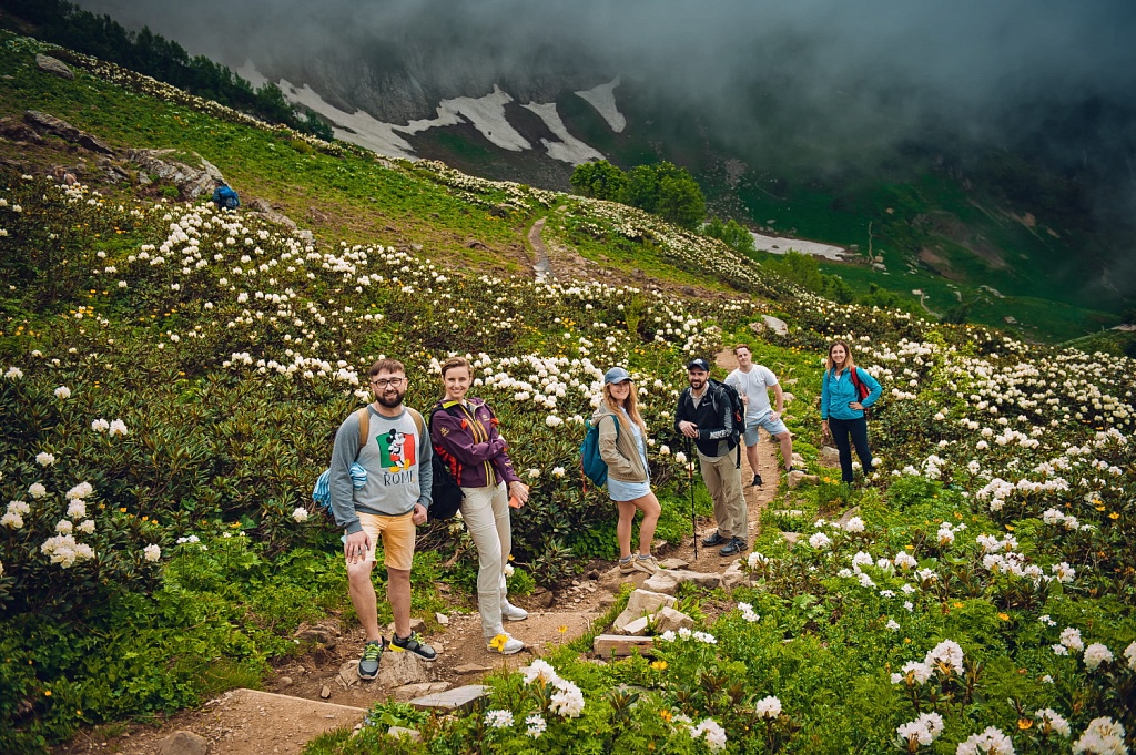 Мы узнали, что рододендрон кавказский является медоносом, а в горных условиях на крутых склонах служит почвозакрепителем. Профессиональные гиды Курорта Красная Поляна рассказали еще много интересной и полезной информации о природе этих удивительных мест. Хотим обратить ваше внимание, что маршрут для вашей будущей группы вы можете подобрать индивидуально, так же, как и тематическое наполнение похода, и его социально значимую цель. В этом вам тоже помогут гиды курорта из «Бюро приключений».