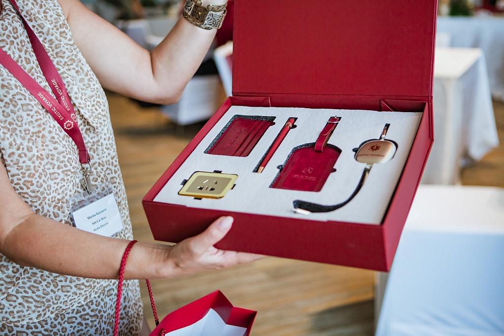 Перед ланчем, в финале деловой части, все гости получили замечательные подарки: с большим вкусом подобранные и оформленные «наборы путешественников» от Exotic Voyage, которые будут сопровождать нас теперь в самых разных поездках.