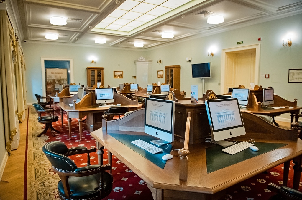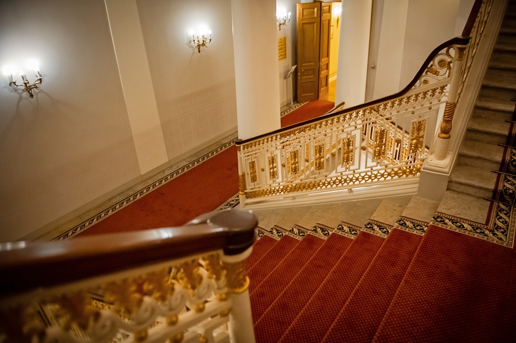 И вот, поскольку вещи в номере, нам пора в путь – по маршруту, сочиненному петербуржанкой Натальей Ториашвили, ее коллегами из Центра Дягилева и их постоянным партнером по логистике и вопросам организации экскурсий – туристической компанией «НИКА». Нас пригласили в те места, где мероприятие может быть уникальным. Прежде всего, это Президентская библиотека имени Б. Ельцина, расположенная в историческом здании Синода рядом с Исаакиевским собором. Учреждение это закрытое (мы проходили по паспортам), но по специальному заказу здесь проводятся мероприятия разного типа – от приватных стратегических советов до статусных конференций на 500 человек. Впрочем, бал в этих роскошных стенах с эффектной парадной лестницей тоже будет незабываемым, особенно если вы его сделаете с Центром Дягилева.