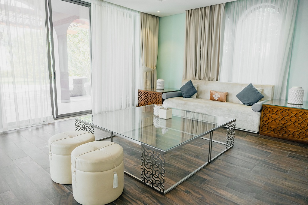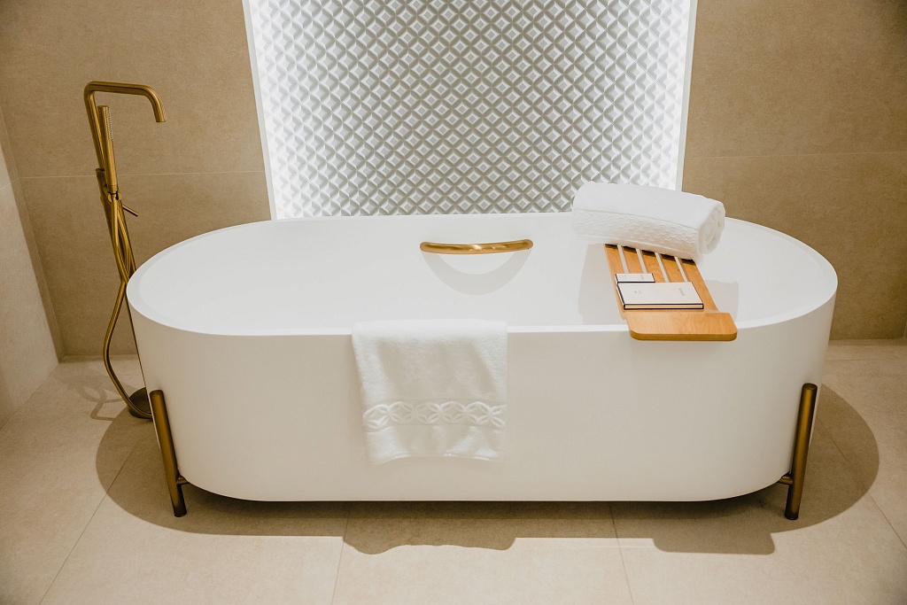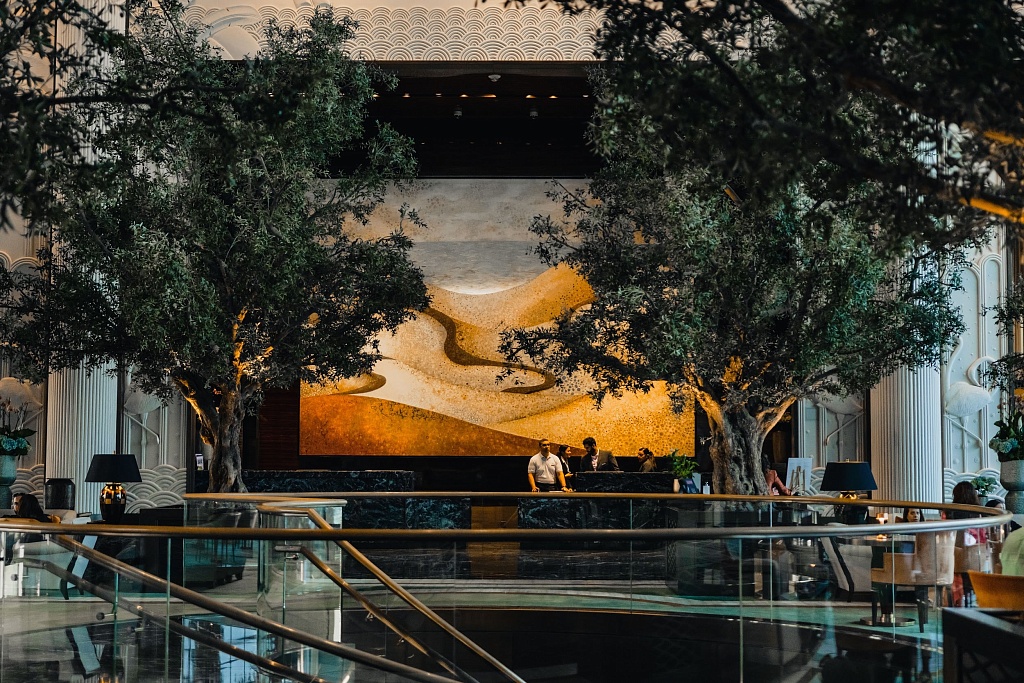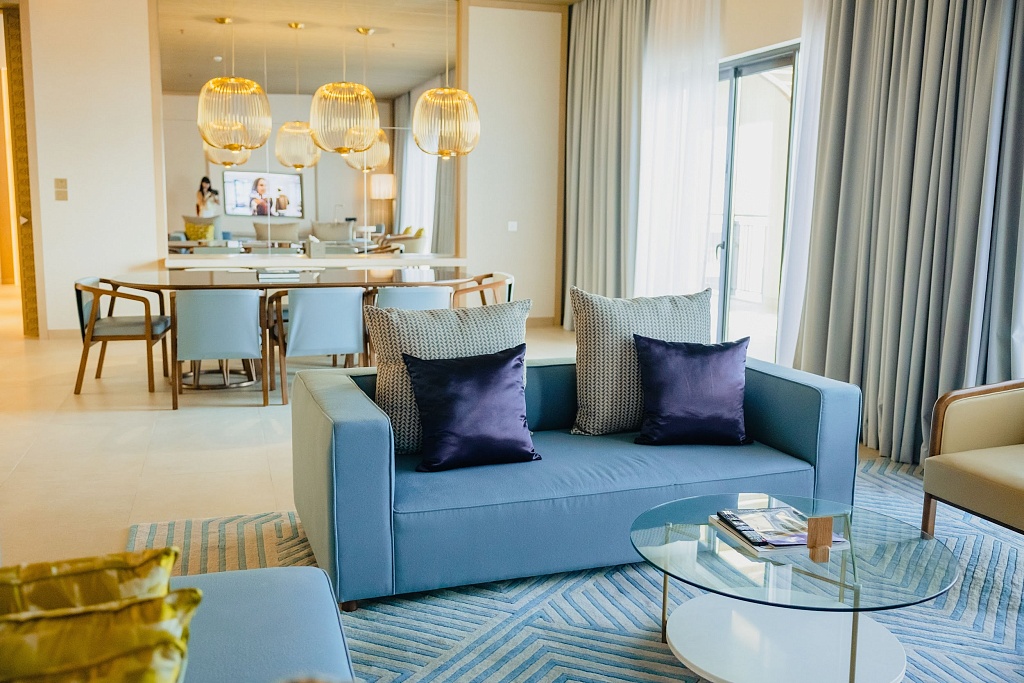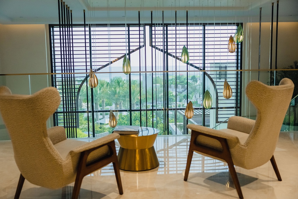 Отель возвышается над заливом как «королевский дворец». Повсюду поражают роскошь и размах. Изысканный дизайн. Качество приема – исключительное. По территории нужно перемещаться на багах. Мы познакомились с различными категориями номеров и с виллами, включая огромные Королевские (2 этажа, на 3 и 4 спальни), которые можно использовать для приватных мероприятий. Очень понравился новый комплекс более камерных вилл, в которых можно автономно расселить всю группу. Мы осмотрели их буквально накануне открытия.