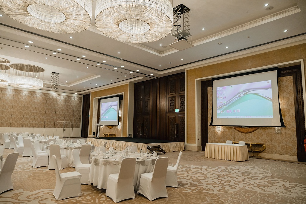 Что касается деловых мероприятий, роскошный Thuraya Ballroom, общей вместимостью до 1400 человек «театром», можно разделить на 5 аудиторий от 80 до 490 участников. Порадовали 8 переговорных с дневным светом и видом на море. Также впечатляют открытые площадки для проведения кофе-брейков и фуршетов.