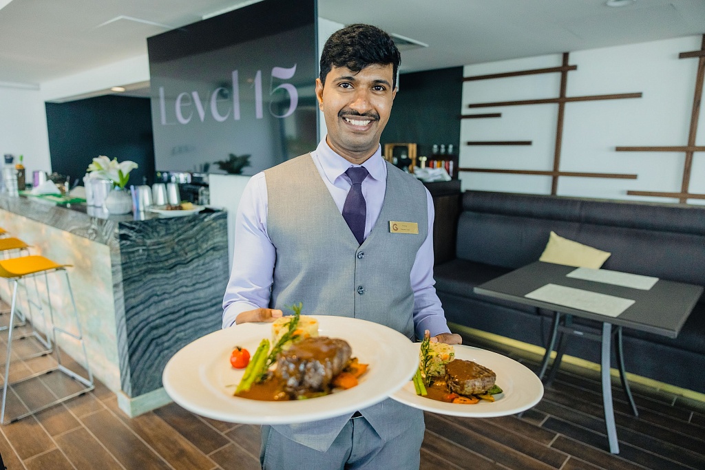 На 15-ом этаже размещен бассейн-инфинити и рядом с ним видовой ресторан, в котором у нас был замечательный ланч со средиземноморским меню. Также привлек внимание классический ирландский паб на первом этаже, в котором в дневное время накрывают бранчи.