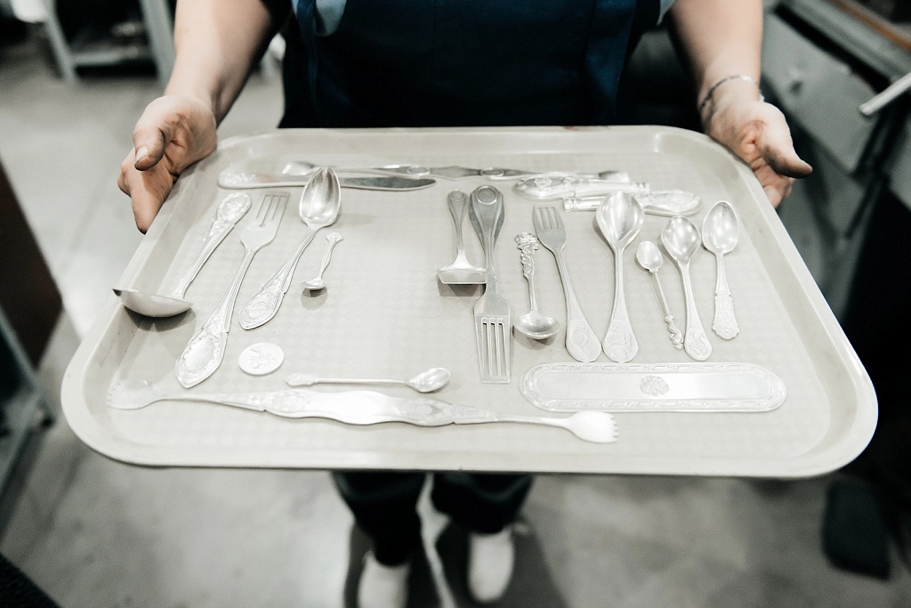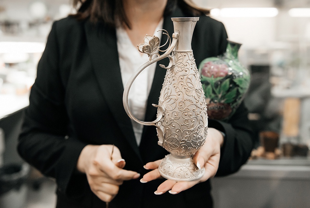 Итак, краткий перечень для корпоративных заказов: фирменные значки, медали и аксессуары; предметы интерьера и столовое серебро, другие изделия с логотипом компании или монограммой персоны; новогодние игрушки, посуда из стекла с серебряными накладками и даже стопки-перевертыши, которые ввел в моду Петр Первый. Мы были очень впечатлены разнообразием вариантов.