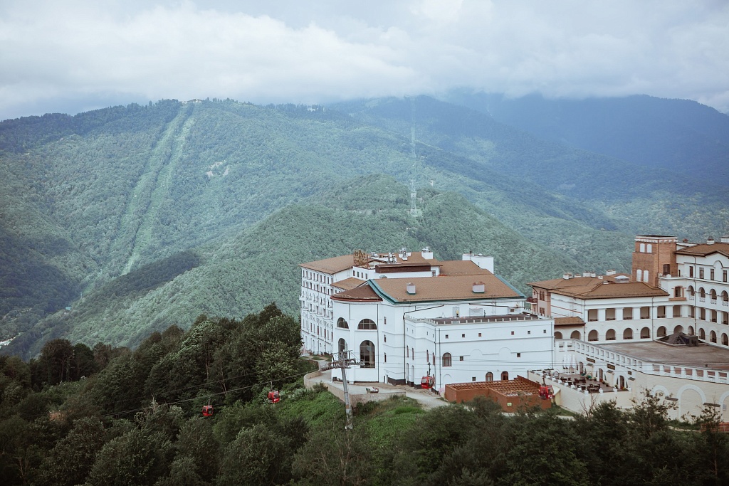 Обед в панорамном ресторане The Grill на 8-ом этаже отеля Novotel Resort and spa Krasnsya Polyana, который известен своими потрясающими видами на горные вершины. После такого красивого ланча мы спустились на «Поляну 540».