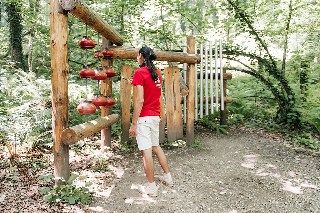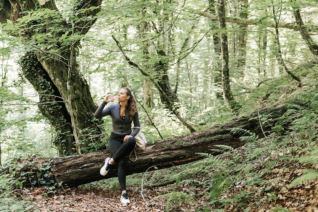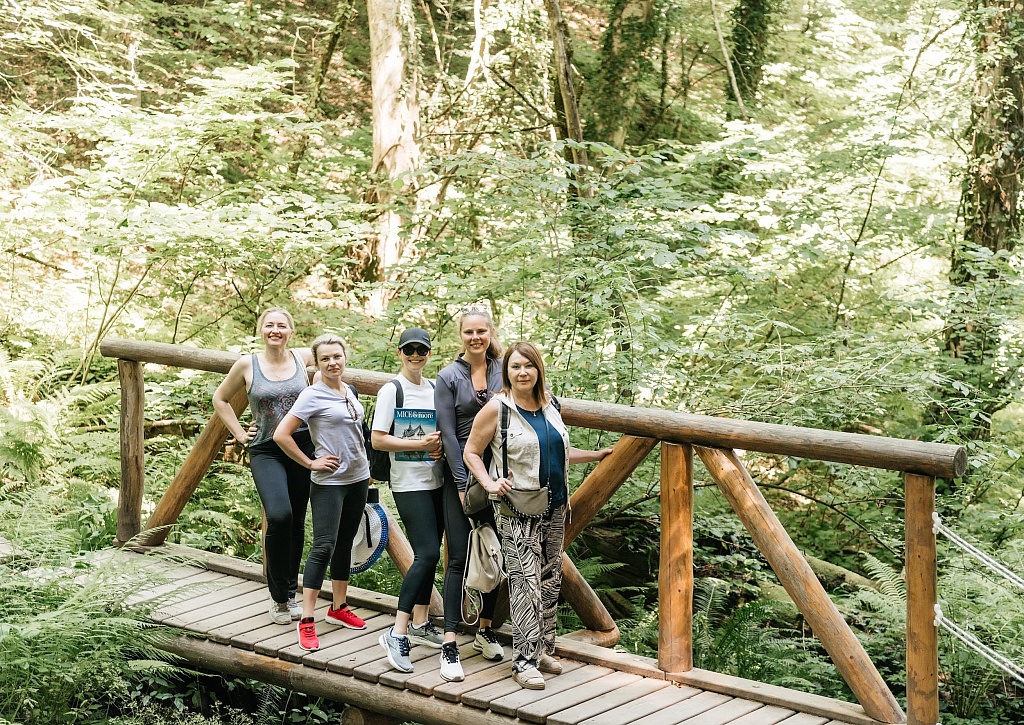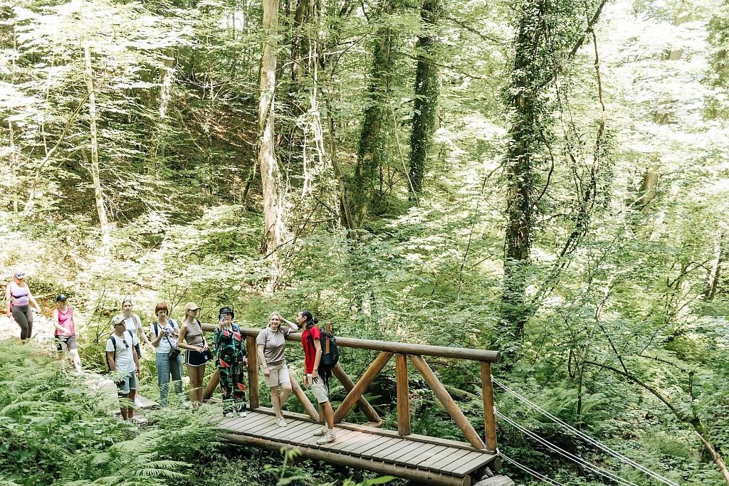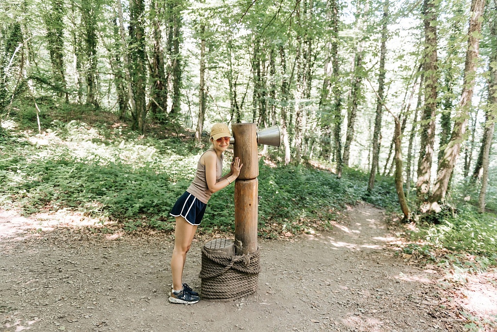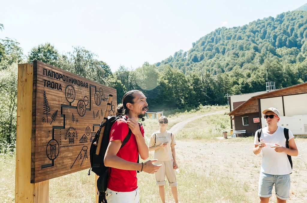 Одна и та же тропа может быть использована под разный формат мероприятия. Год назад мы здесь были с детьми в специальном Family фамтрипе. В этом году у нас фитнес-тур. Маршрут был несложный для каждого участника, но при этом наполнен регулярными подъемами и спусками. А для того, чтобы участники перевели дух, во время остановок и пауз организаторами были предусмотрены fit-ланч боксы для полезного перекуса. Следуя по маршруту, мы были вознаграждены прекрасными моментами, встречая на пути быстрый ручеек, красивый водопад, подвесной мост или интерактивную музыкальную станцию, где через вибрацию ксилофонов можно почувствовать приток энергии. Казалось, что тропа сама взаимодействует с нами.