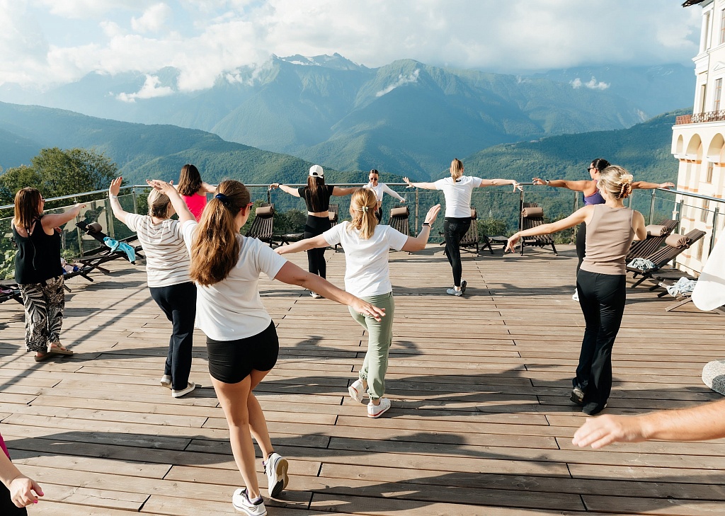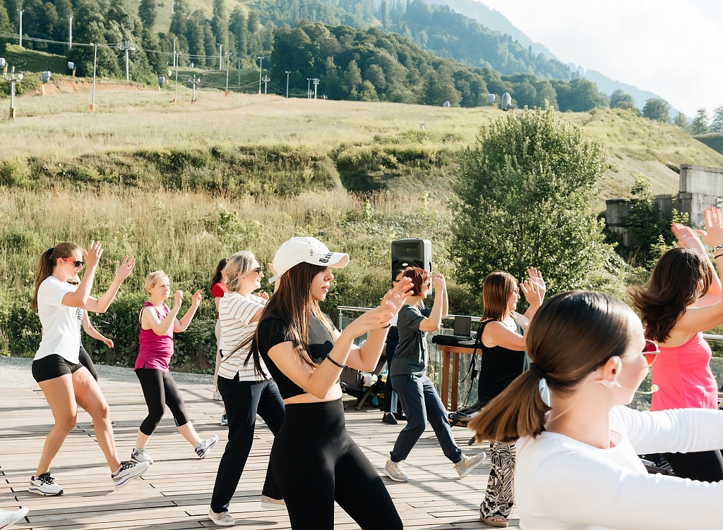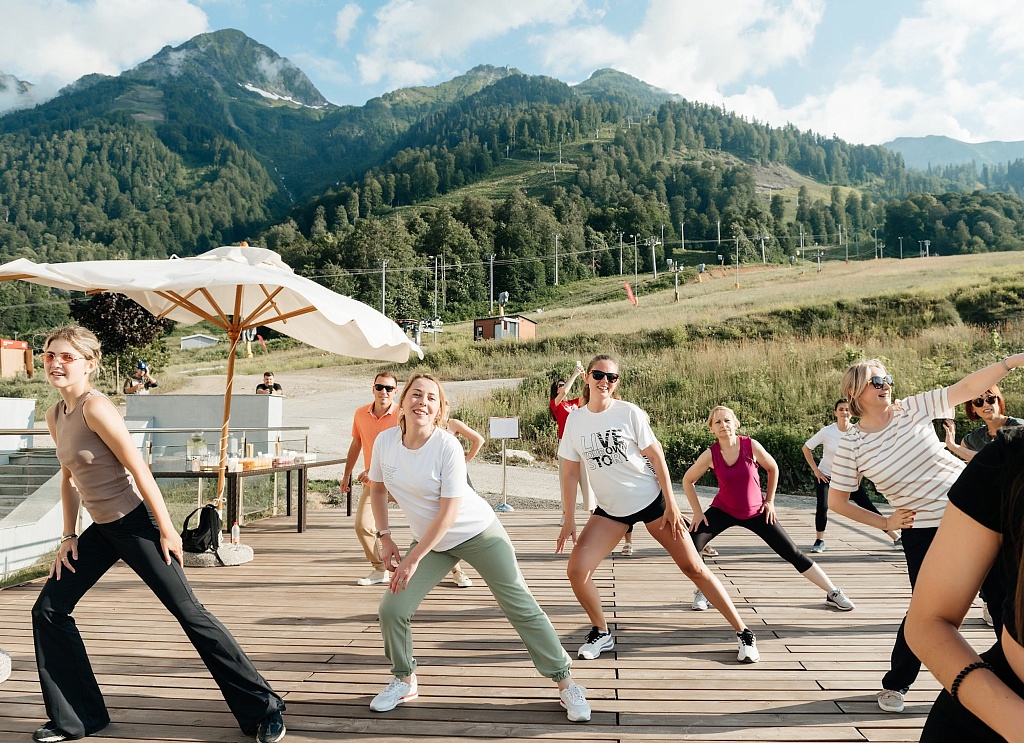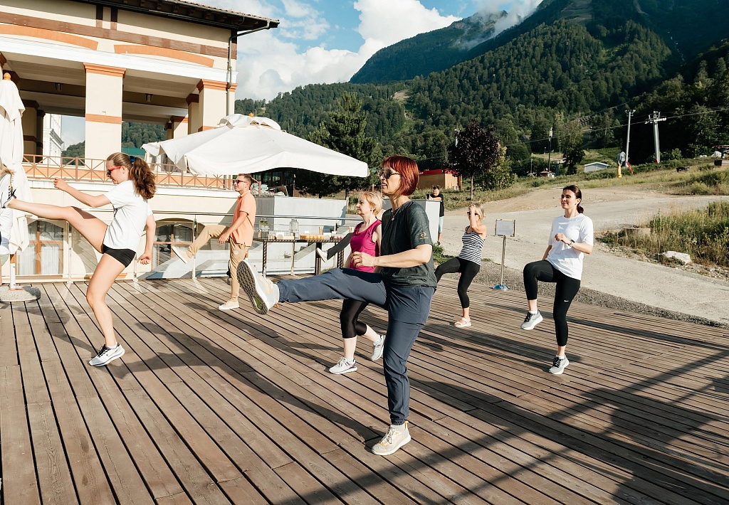 Нам очень повезло с погодой, хотя горы — это всегда непредсказуемо. Как оказалось, в горах может быть жарко, ни облачка. Для утренней зарядки нам была предложена очаровательная полянка с симпатичными ковриками для йоги. 40 минут под руководством внимательного инструктора пролетели на одном дыхании. Участвовали все, независимо от уровня физической подготовки. Это отличный элемент тимбилдинга и прекрасный старт, который заряжает энергией гор на весь день!