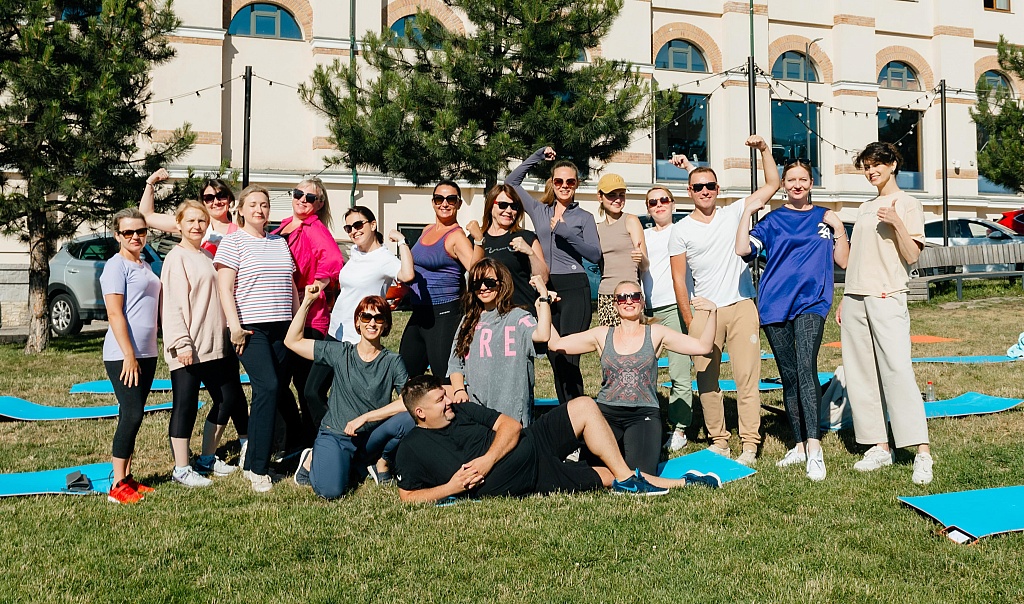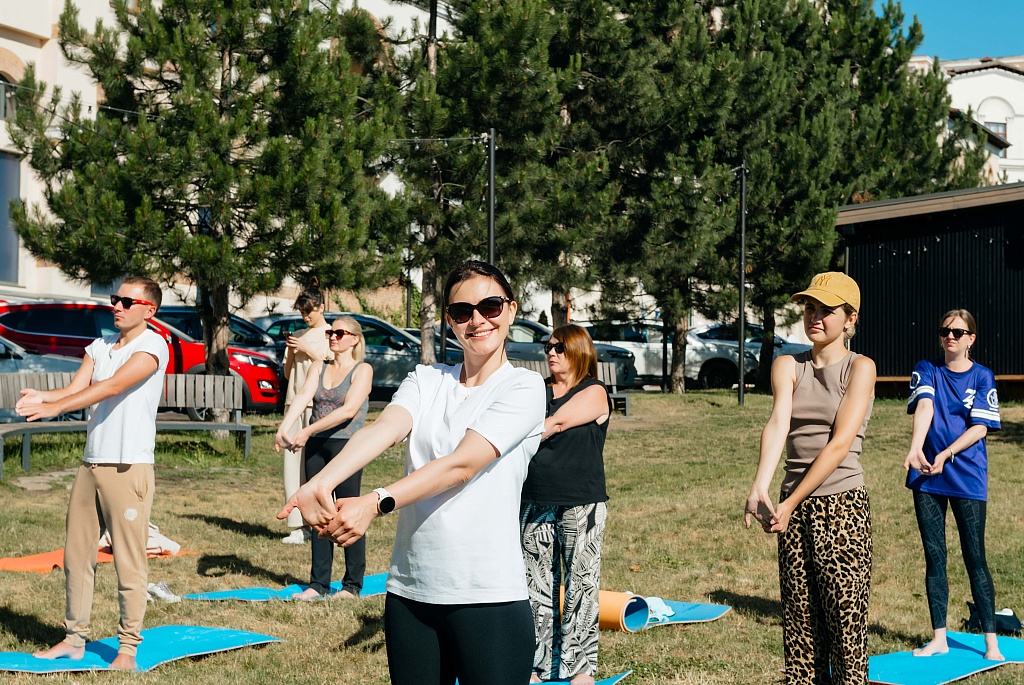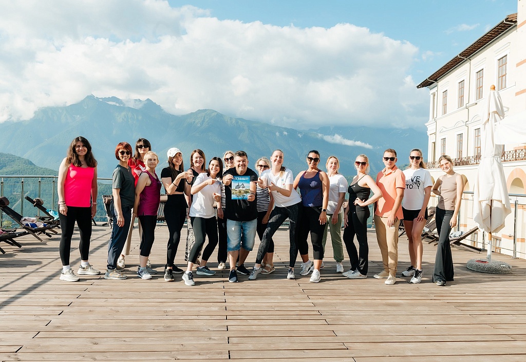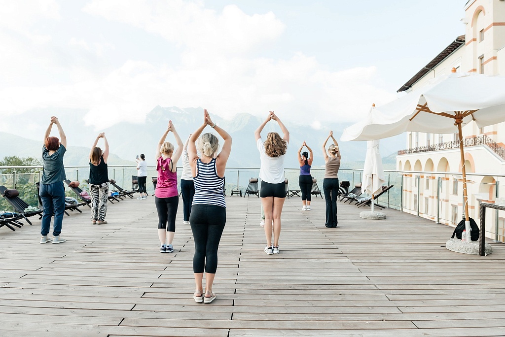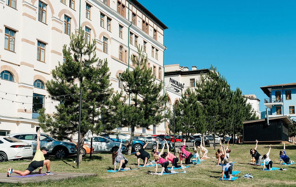 Нам очень повезло с погодой, хотя горы — это всегда непредсказуемо. Как оказалось, в горах может быть жарко, ни облачка. Для утренней зарядки нам была предложена очаровательная полянка с симпатичными ковриками для йоги. 40 минут под руководством внимательного инструктора пролетели на одном дыхании. Участвовали все, независимо от уровня физической подготовки. Это отличный элемент тимбилдинга и прекрасный старт, который заряжает энергией гор на весь день!