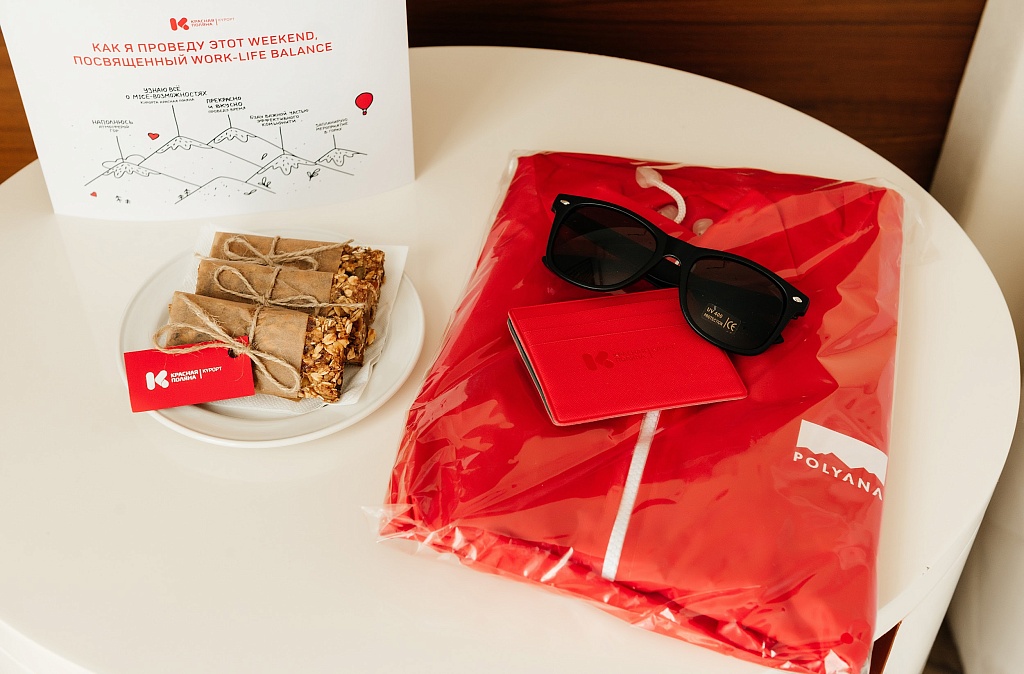 И если продолжить о ценностях бренда, конечно, нас очень тронули знаки внимания, оказанные нашей группе Курортом Красная Поляна. При заселении нас ждали в номерах открытки и фитобатончики, согласно теме нашей программы и концепции отеля. Для прогулок мы получили в подарок фирменные ярко-красные дождевики. Вечером после долгого и сложного дня мы нашли на прикроватном столике аромасвечи для снятия усталости. Очень понравились картхолдеры для карточек от номеров и банковских. А сувенирные чехлы для чемоданов просто супер! Это все о заботе о клиентах.