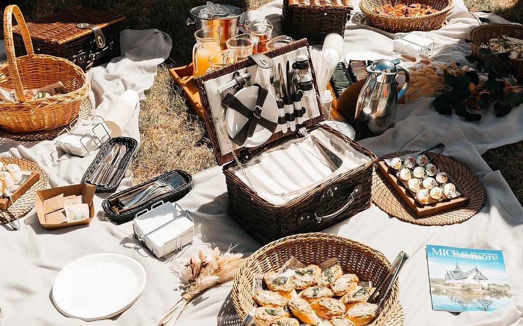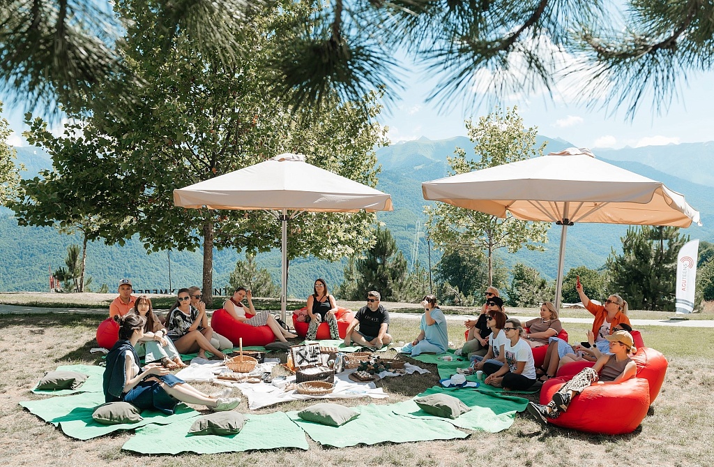 Лекция на отрытом воздухе об осознанном туризме, о «Зелёном MICE» и возможностях Курорта Красная Поляна в сопровождении с пикниковыми корзинами на лужайке и панорамными видами на горные хребты