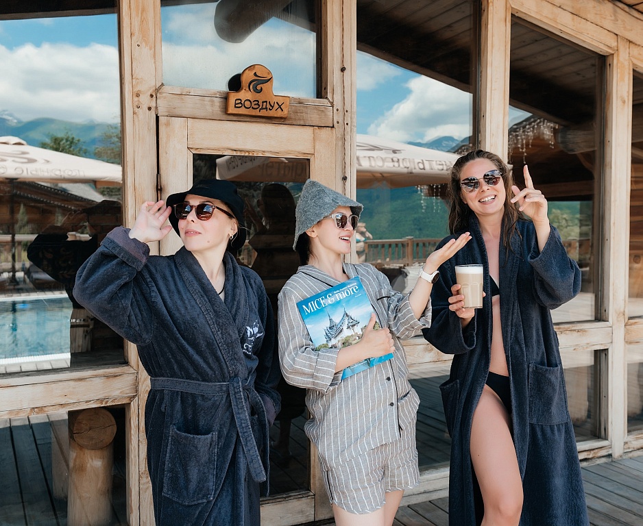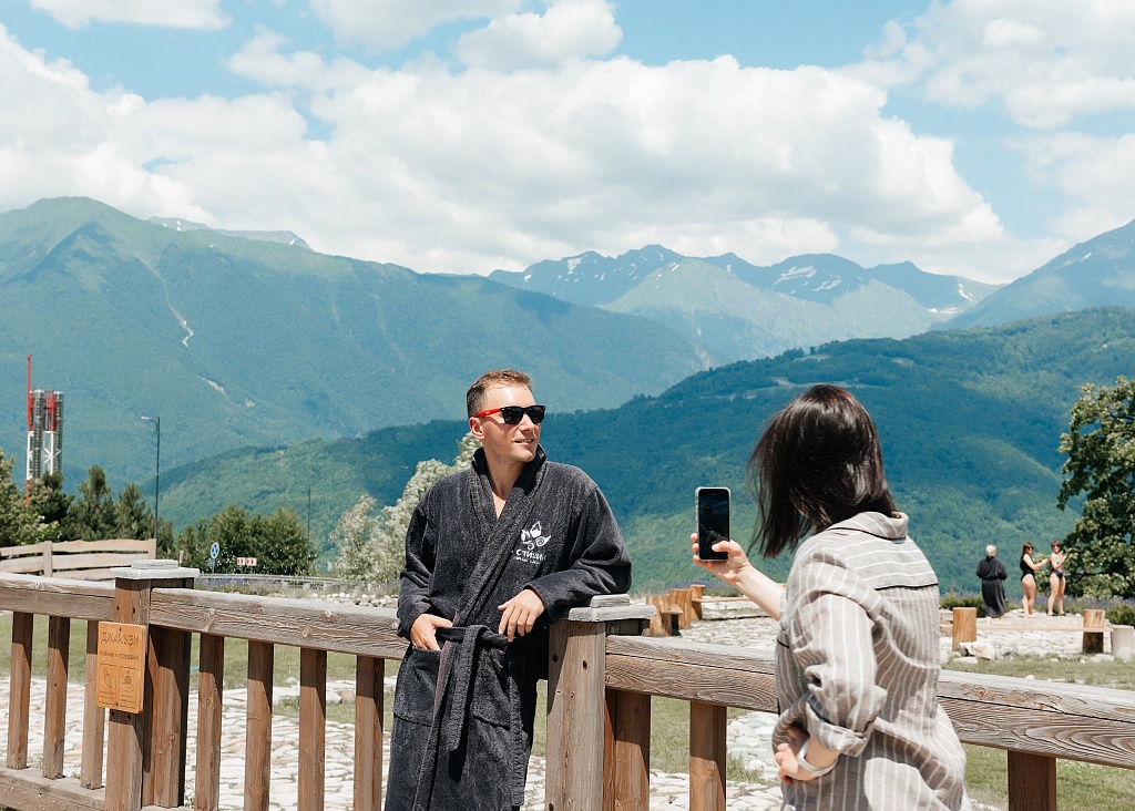 Одно из самых популярных мест на Курорте Красная Поляна круглый год! Летом особенно хороши сразу после хайкинга (как было в нашей программе). Можете посещать общую зону, можете закрыть баню под группу. Повсюду обалденные виды (извините, но иначе не скажешь). Банщики невероятные. Для участников нашего тур была проведена ароматерапия с подробным и увлекательным рассказом о травах, их полезных свойствах, и, конечно же, об уникальной природе, на просторах которой расположился Курорт.