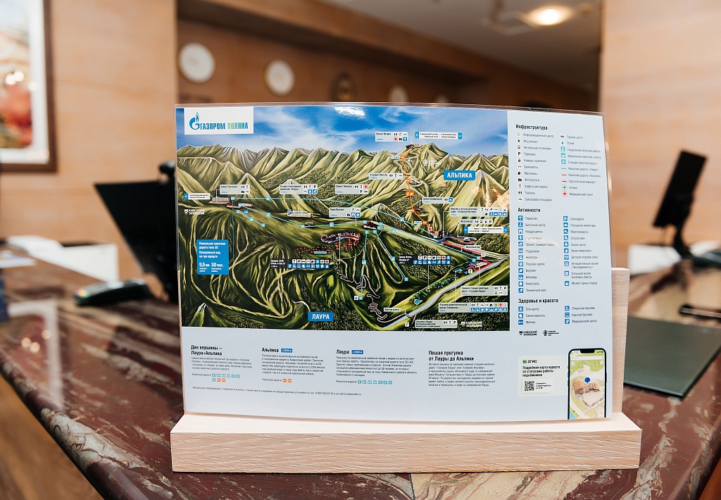 Курорт «Газпром Поляна» — это 2070 гектар общей территории, 2 отеля категории 5*, 40 км горнолыжных трасс, 7 км трасс для беговых лыж, 2 горные вершины - «Лаура» и «Альпика», лыжно-биатлонный комплекс «Лаура», уникальная канатная дорога типа 3S (панорамный вид на 3 курорта, 5 км плавного полета, 30 человек вместимость кабины), 2 спа в горах с панорамными бассейнами, 7 бассейнов (открытые подогреваемые и крытые), ТРЦ «Галактика» с аквапарком, бильярдом, боулингом и кинотеатром.