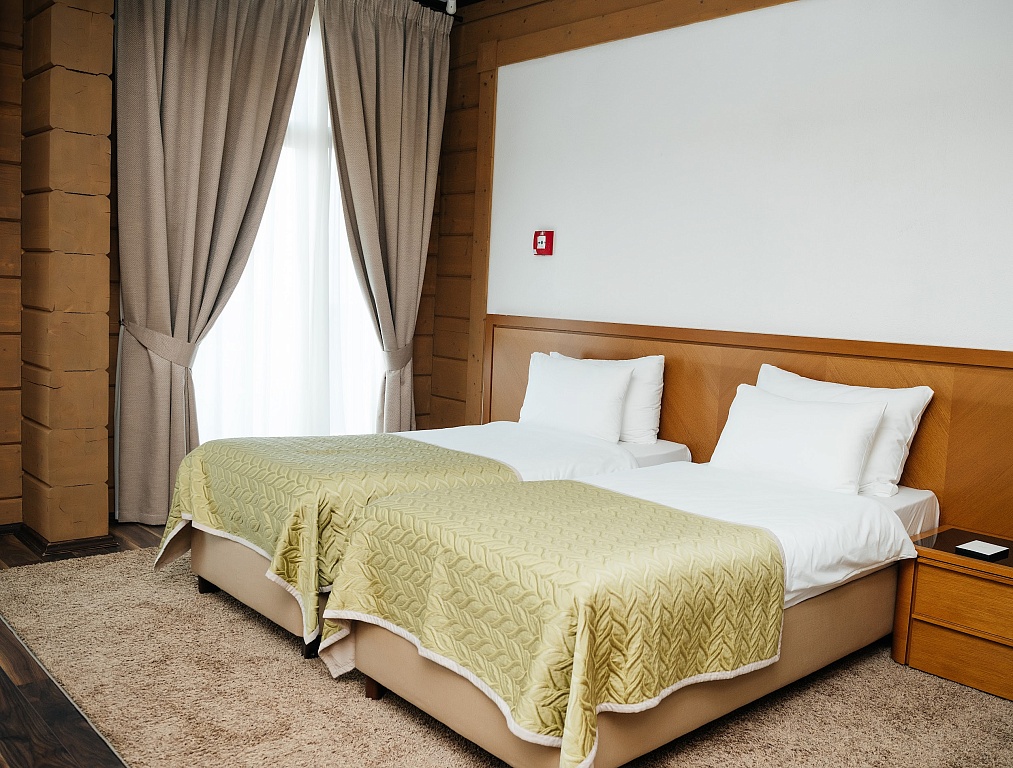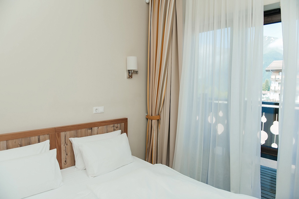 151 номер, 84 апартамента, 28 коттеджей с деревянным убранством – Шале и Шале Премиум (площадью до 350 кв. метров). Закрытая территория с открытым теплым бассейном.