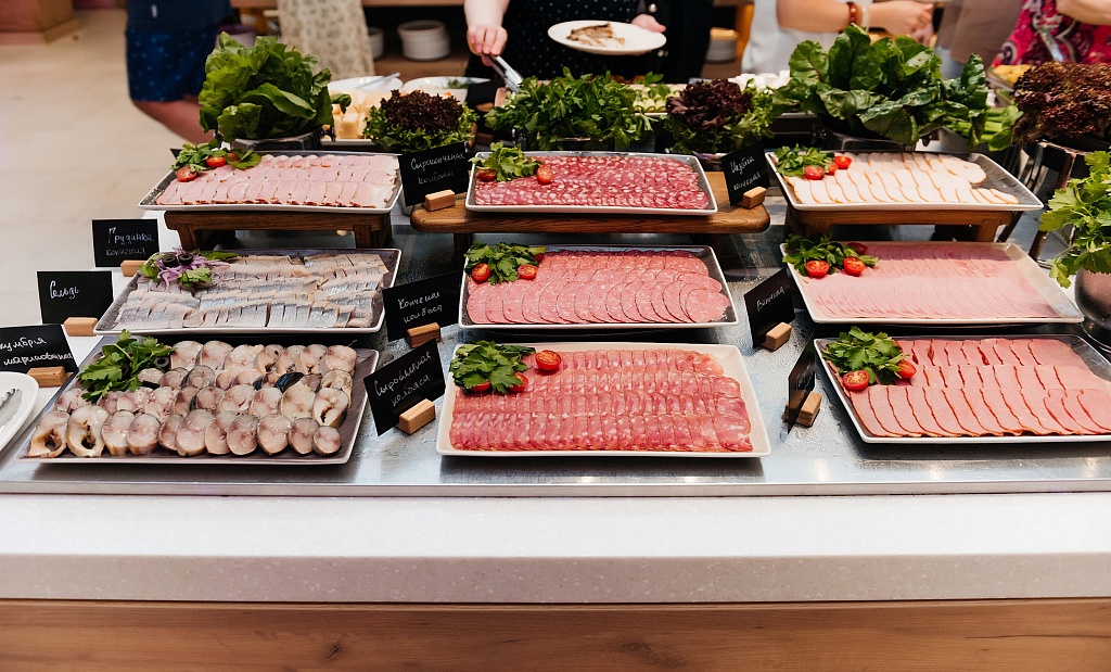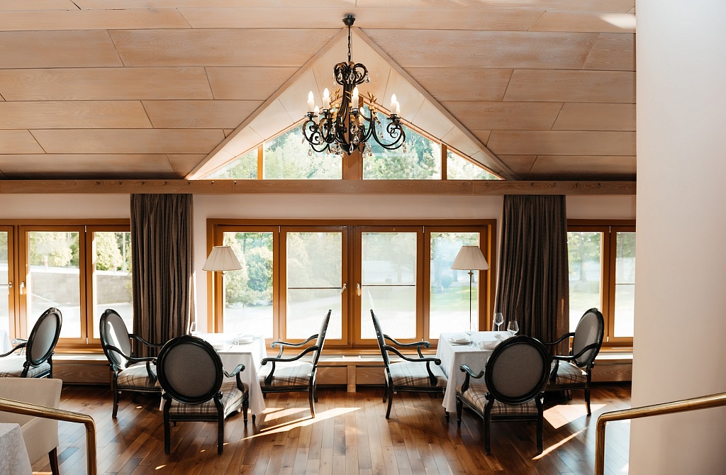 В гостиничном комплексе три корпуса – А, В и С. В корпусе А гостей обслуживает ресторан «Континенталь» на 150 человек (европейская кухня. В корпусе С – два ресторана: летняя терраса «Лаура» с видом на горы на 40 мест (с элементами паназии в авторском прочтении) и классический семейный «Павильон» на 160 гостей (кухня приближена к домашней). Рестораны в корпусе В: «Черная лисичка» на 50 мест с авторской кухней гастроботаника Андрея Колодяжного (обладателя премии «Золотая Пальмовая Ветвь» и рекомендации гида Мишлен), камерный уютный «Сезон» на 60 человек, и большой банкетный «Охотничий зал» на 300 гостей (в меню разнообразие всех кухонь мира).