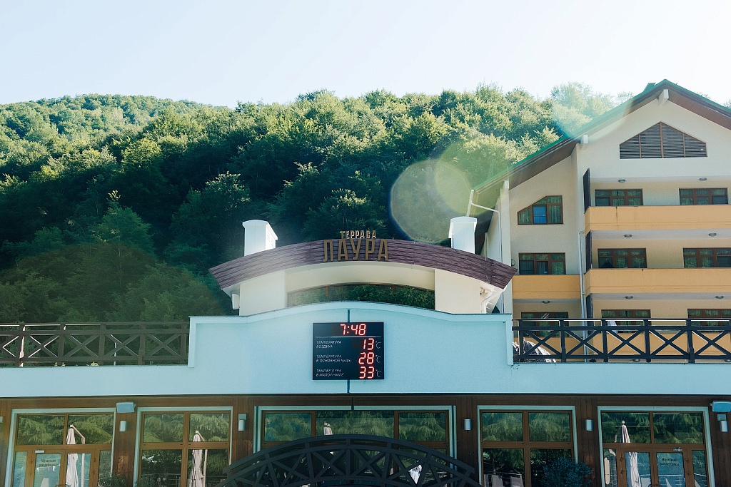 В отеле 3 ресторана: основной «Панорама» на 270 мест (название получил благодаря панорамным окнам с шикарным видом на горы), «Haut» на 100 гостей (в меню встретились море и горы) и стильный бар «Гранат» для общения в непринужденной обстановке под вкусные закуски и широкий выбор напитков.