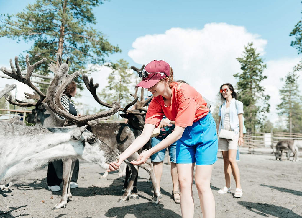 Самые яркие впечатления, конечно, от общения с оленями. Сначала, когда открывают загон, кажется, что на тебя несется целое стадо. Это немного страшно, но только в самый первый момент. Потом ты начинаешь их кормить из ведра и с руки, гладить по мохнатым носам, по нежным «молочным» рогам, ловишь невероятный кайф от общения с животными.