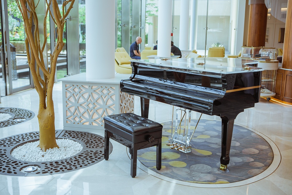 Kempinski is located in the waterfront complex of Al Muj, which has been called the "new heart of Muscat". It offers state-of-theart 11-room business and meeting facilities, world-class bars and restaurants, an in-house bowling and entertainment centre, a fully equipped fitness centre and an authentic spa. With an area of 1,100 square meters, the Ballroom Muscat is admired, it is shaped like a diamond and has the best projection equipment in the city.