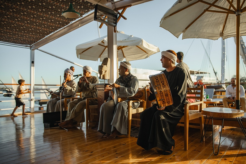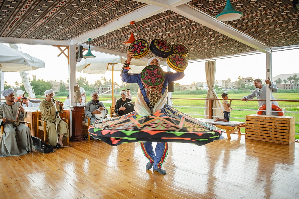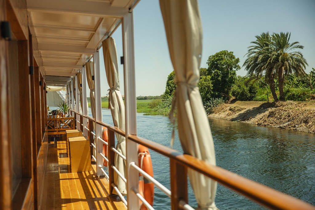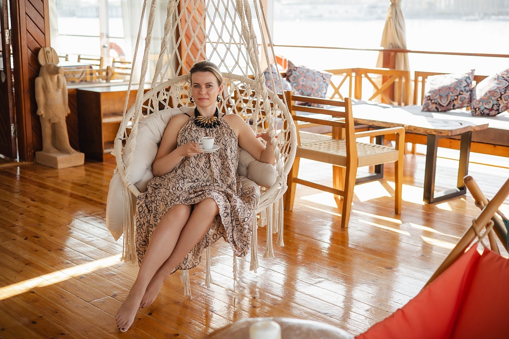 – We spent a day on dahabeah. According to Wikipedia, a dahabeah: “is a type of flat-bottomed, one-and-a-half-masted sailing and rowing vessel used for voyages along the Nile River in 1820–1920 by wealthy Europeans.” In other words, there’s no motor on these yachts so we were towed by a tugboat, unfurling the sails at points along the way. There are 10 twin cabins and two suites with a balcony on board. Peace and quiet. During the cruise, we admired the natural landscape, lazed in the Jacuzzi, swung in hammocks, sunbathed and ate delicious food, and in the evening – were entertained by an interactive folklore show. Once again, we should note that at the time of our trip, Melc Travel Group was finishing its own luxury dahabeah for 20 passengers. It will be christened “Cleo” in honor of Queen Cleopatra, who hails from Alexandria just like Azza Zaghoul.
