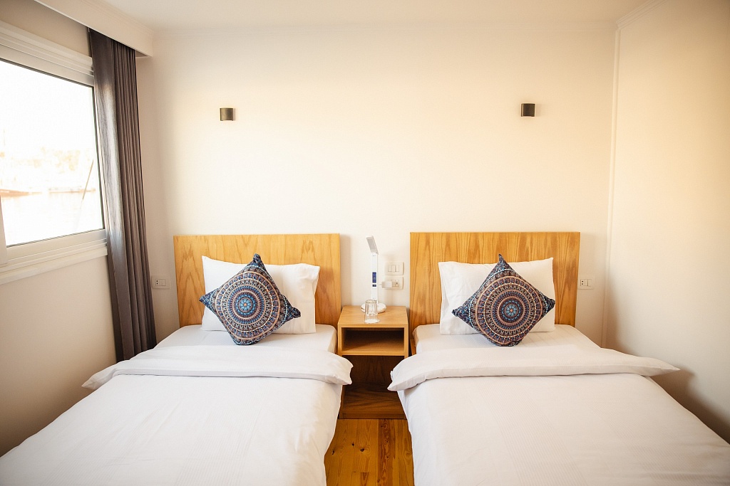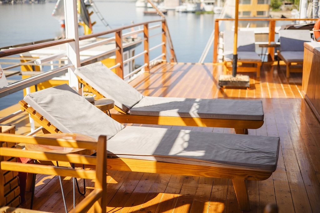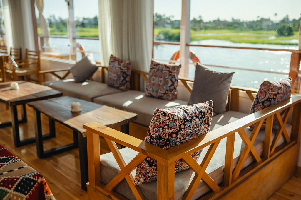 The yacht will offer authentic boutique cruises on the Nile. All services on board will be personalized using guest profiles. The bed linen on board is made from the finest 400 thread-count cotton. The towels, also made of 100% cotton, are specially made for Cleo. Solar panels will power the ship from midnight to morning to avoid the noise of the generators. The engine will be towed to avoid noise during sailing and at night. Highly-qualified chefs will cook specially for the guests.